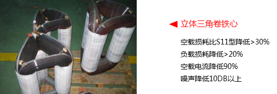 與目前國標(biāo)的S11型配電變壓器相比,立體卷鐵心一級(jí)能效變壓器空載損耗降低30%以上,負(fù)載損耗降低20%以上,總損耗降低25%以上??蛰d電流和噪聲水平均大幅度降低。