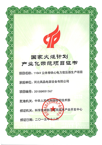 國(guó)家火炬計(jì)劃產(chǎn)業(yè)化項(xiàng)目證書